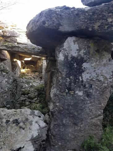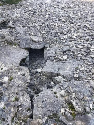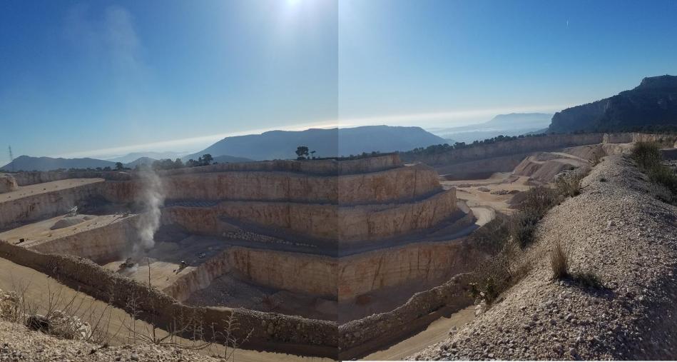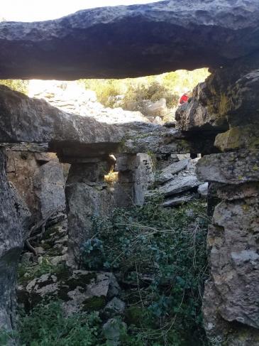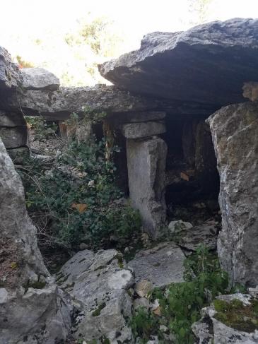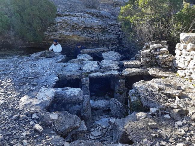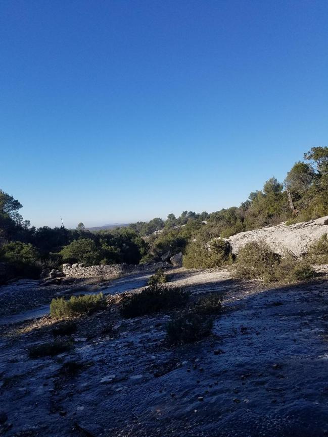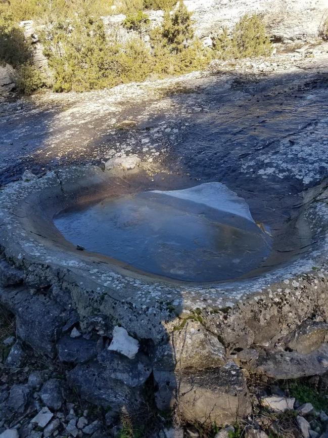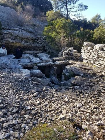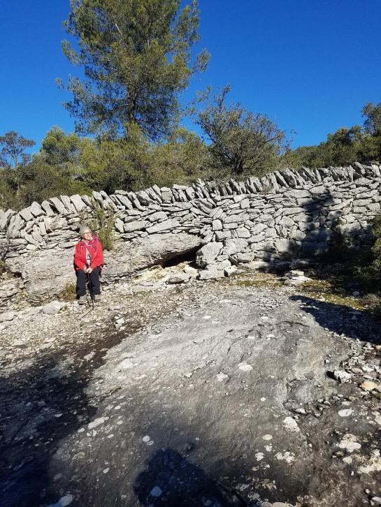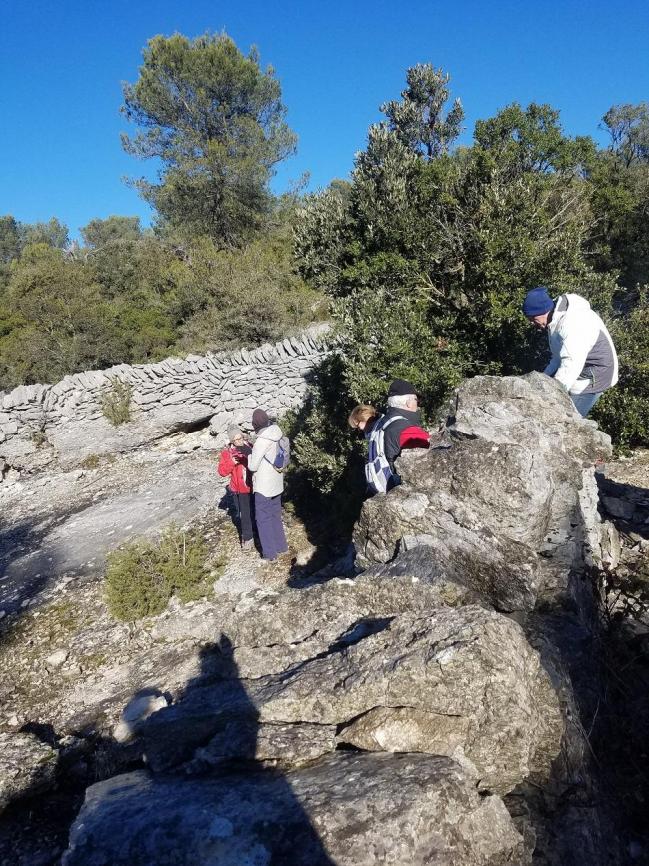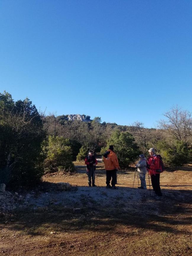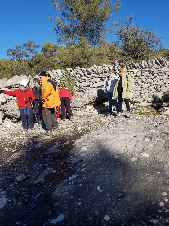 Sous un beau ciel bleu et un soleil hivernal nous sommes arrivés près d'un refuge avec une aire de pique nique. Après avoir installé quelques tables et des sièges, nous avons repris nos voitures pour rejoindre le point de départ de notre marche qui se situait à l'intersection du GR 99 et de la route forestière. Cette marche d'environ 5 km sur une piste incendie nous a conduit jusqu'à une citerne ou nous avons décrouvert les ruines d'une construction permettant de recueillir les eaux de pluie, l'impluvium ou aiguier. Un aiguier est une construction en pierre qui servait à recueillir les eaux de ruissellement avec un système de récupération appelé impluvium et un réservoir construit ou creusé dans la roche. On trouve ce type de construction surtout dans le midi de la France , les dalles et les pierres impressionnantes utilisées pour cette construction nous montre l'importance de l'eau dans cette zone aride du plateau. En continuant sur la piste nous arrivons au dessus d'une brèche géante dans le flanc du plateau calcaire c'est une impressionante carrière en activité actuellement.