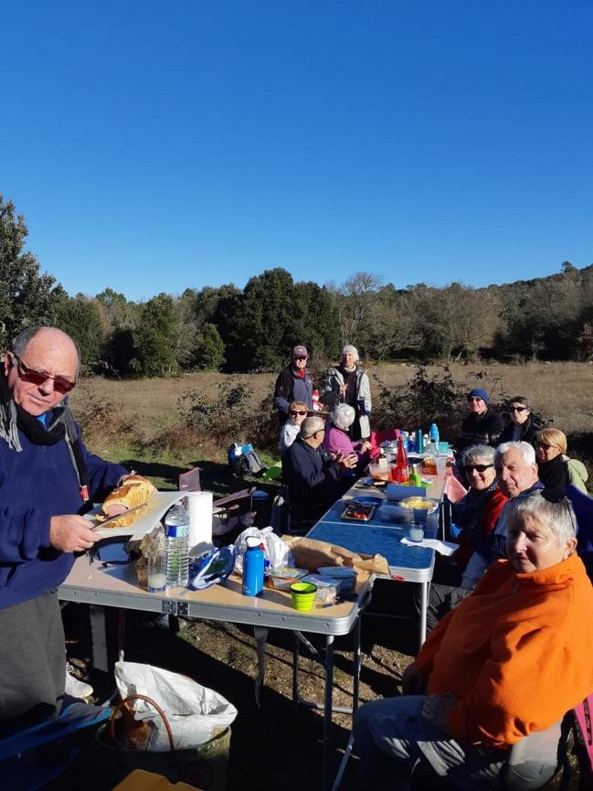 On reprend le sentier en sens inverse, jusqu'au parking et nous repartons sur notre lieu de pique-nique. Après un repas partagé sous le soleil avec des grillades et de nombreux desserts... nous reprenons la route pour un retour vers les 16h30 à La Seyne. Magré le froid vif du matin, toutes les flaques étaient glacées et l'arrivée rapide de l'ombre, ce fut une belle journée de rencontre et de partage, nous remercions Nicole pour cette découverte.